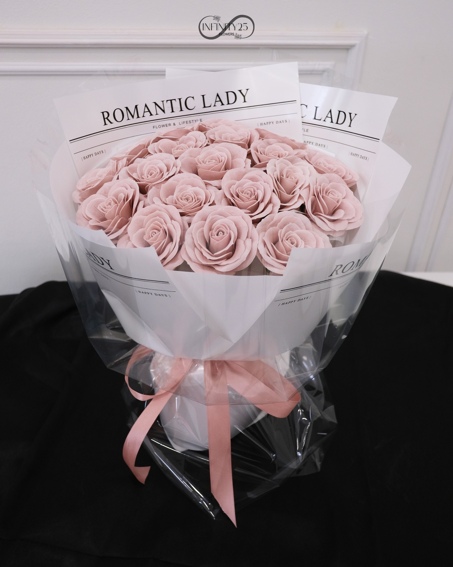 Bó hoa được làm từ 19 bông hồng sáp màu hồng được gói trong giấy gói "quý cô lãng mạn" và giấy bóng kính cùng một dải ruy băng màu hồng đồng bộ.